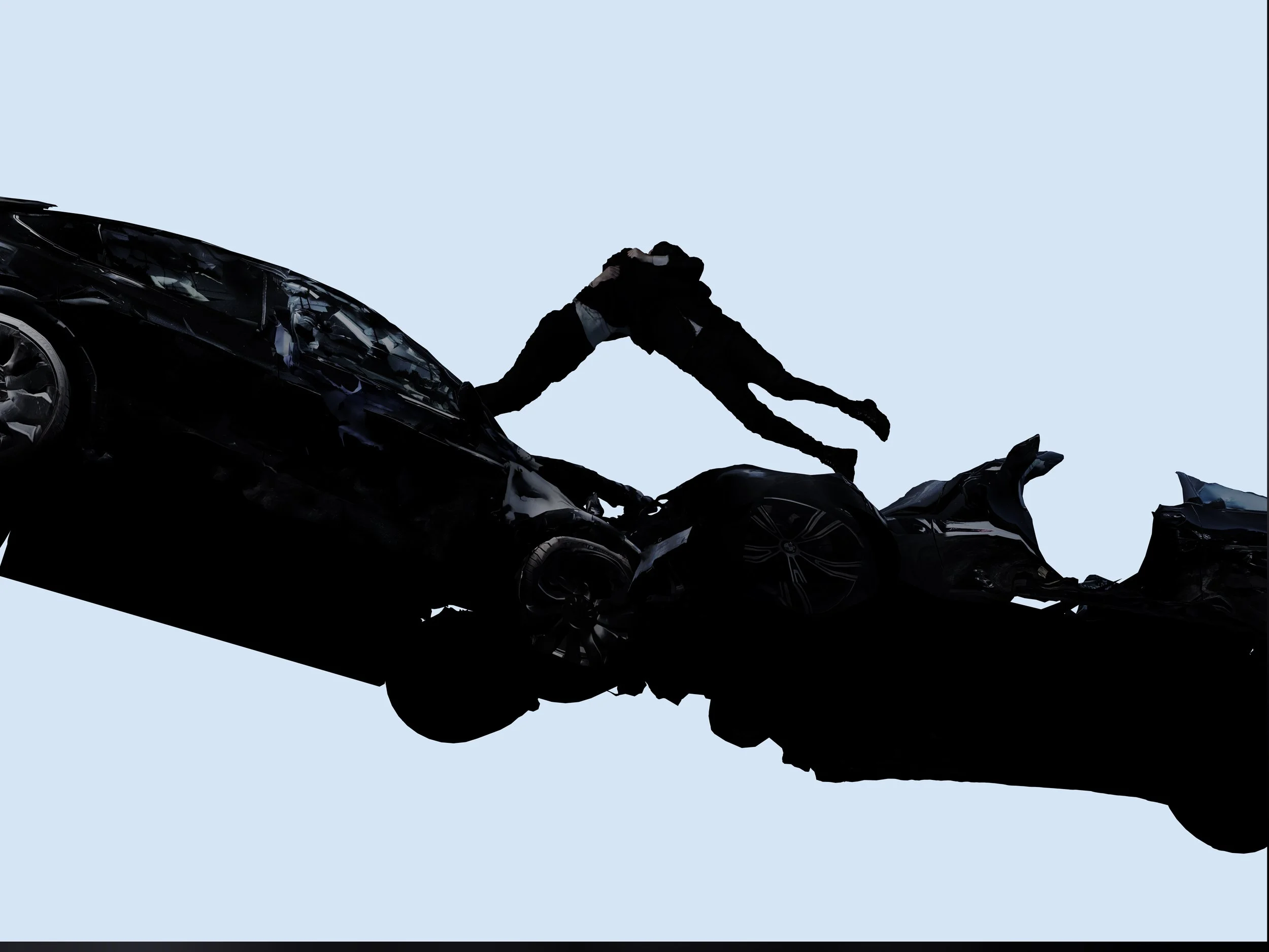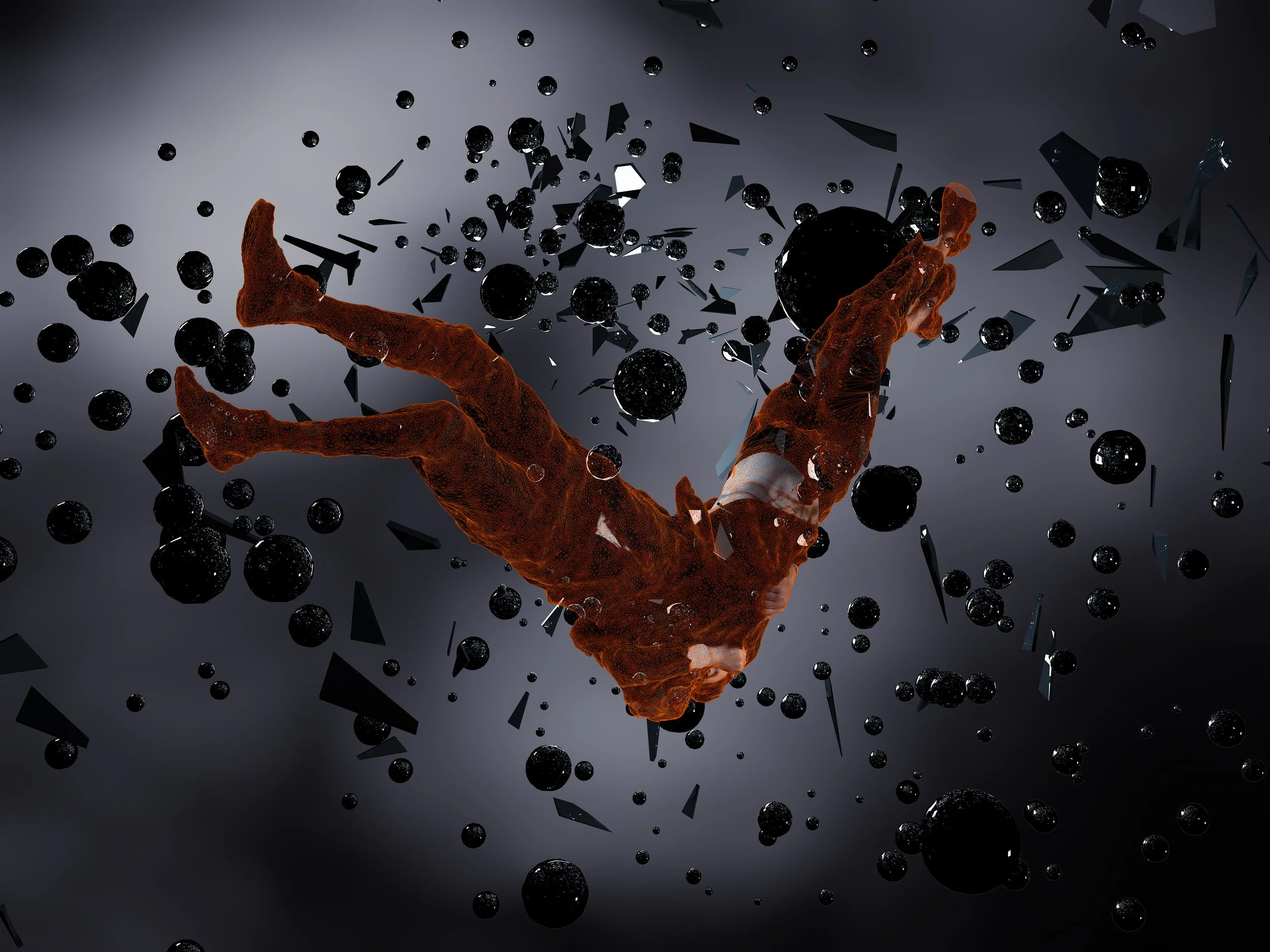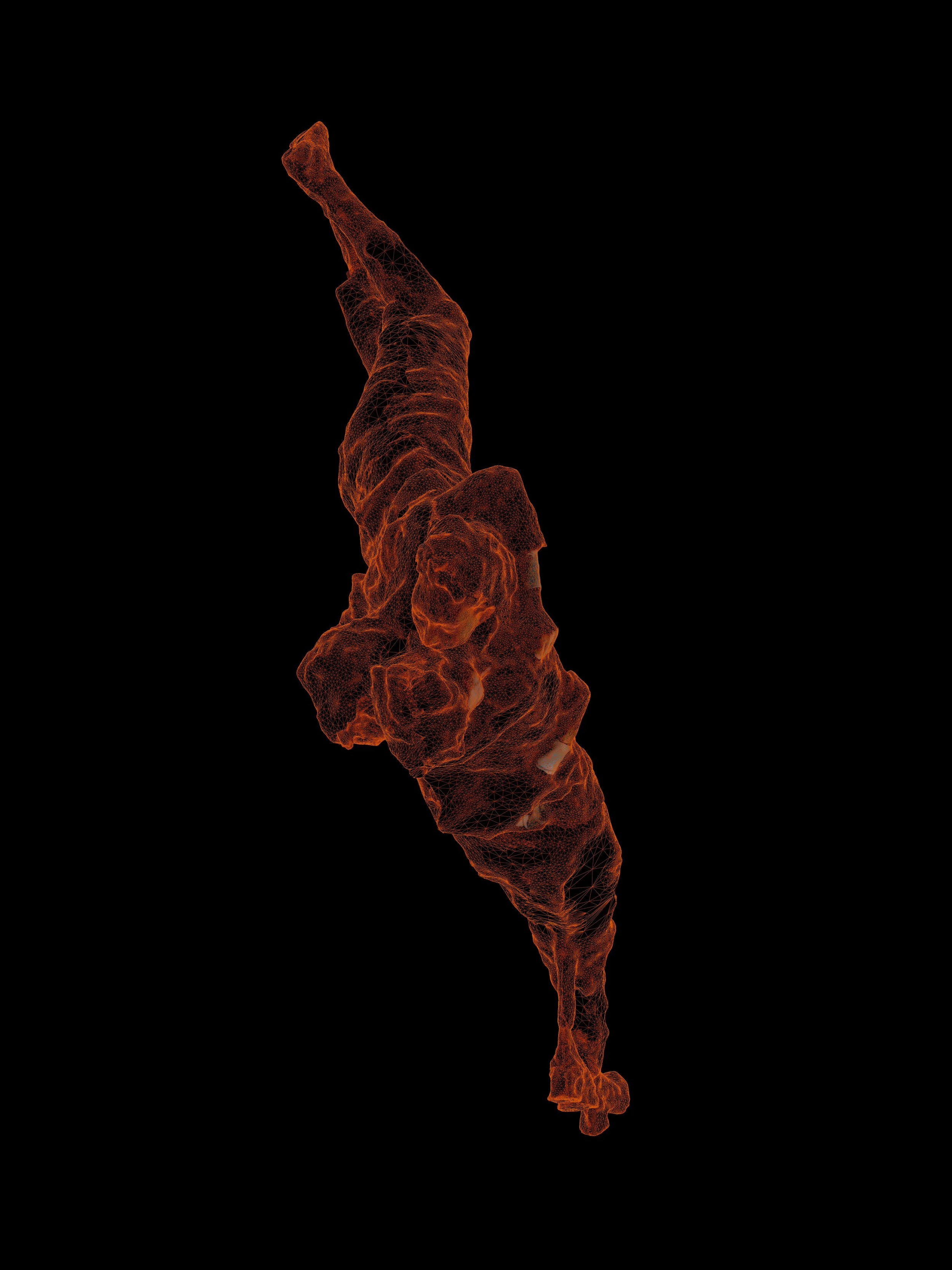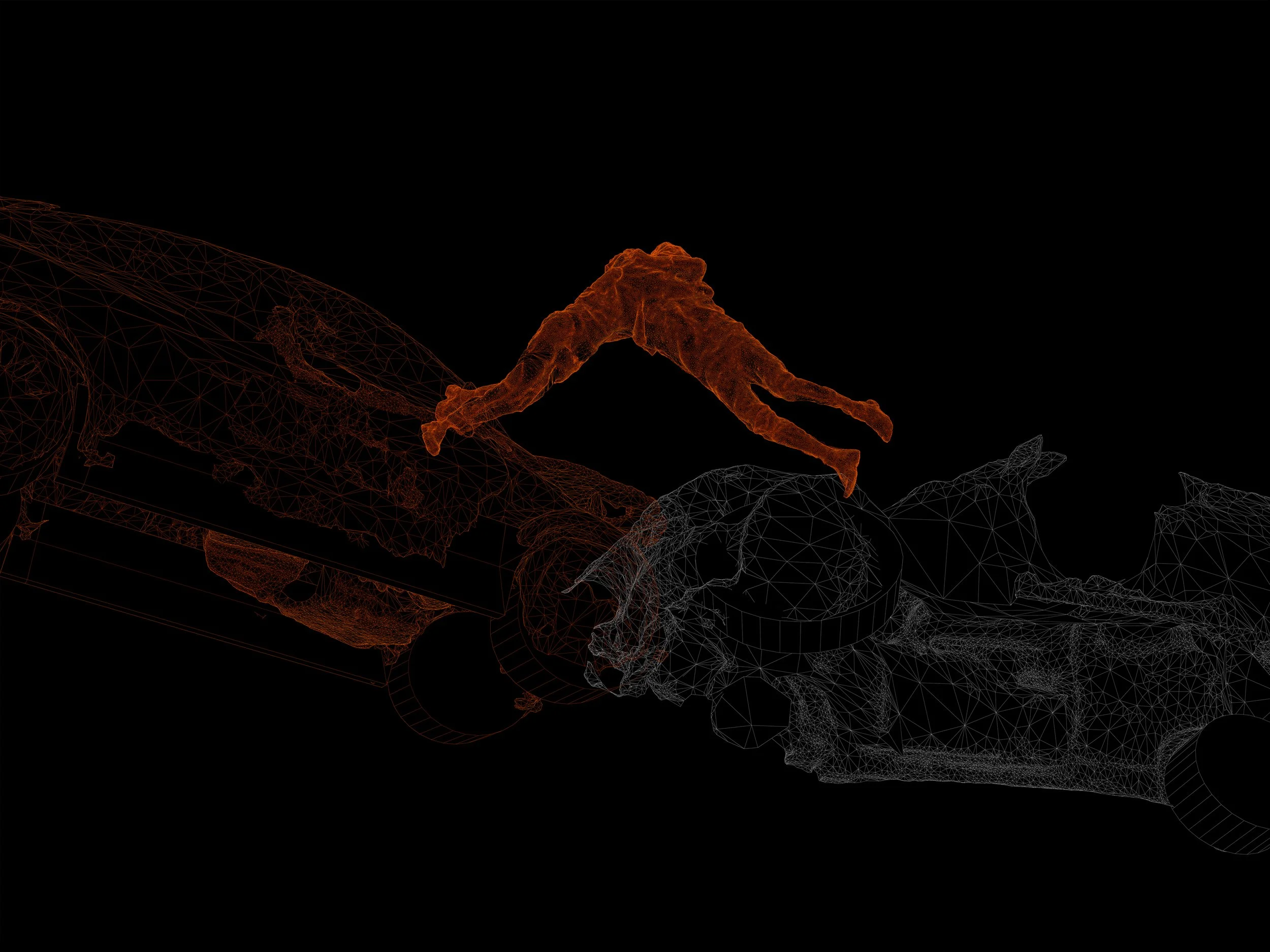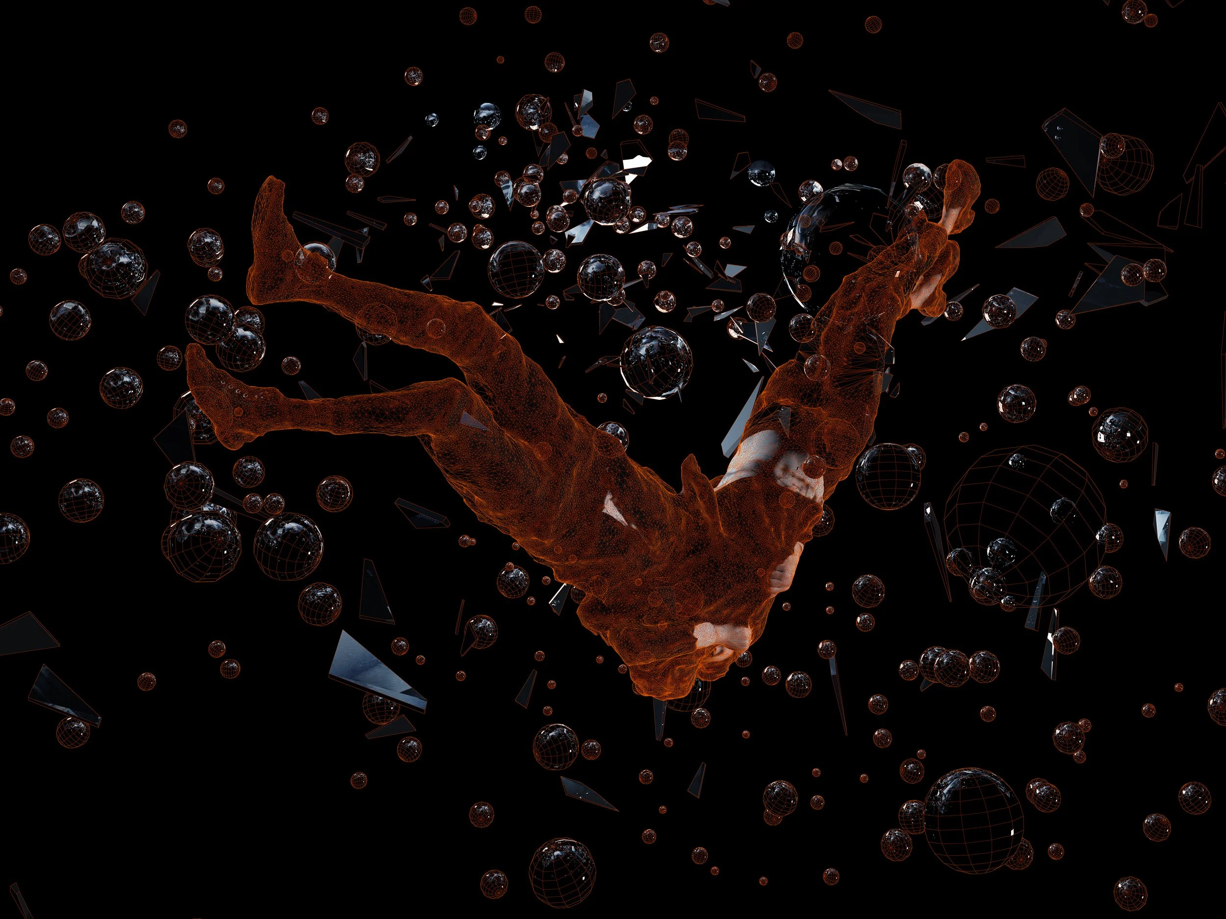 Encounter is a life-scale virtual sculpture of the instant two cars collide, as their drivers are hurled from their seats, and become entangled mid-air. Surrounding these floating figures are shards of spinning glass, and a swarm of mirrored spheres that reflect the immediate environment. From one angle, the female figure, flung from her seat, appears to be locked in an embrace with the male figure. Seen at another angle, the man seems to be embracing himself. The faces are serene, with eyes closed — dreaming, or in a state of rapture.