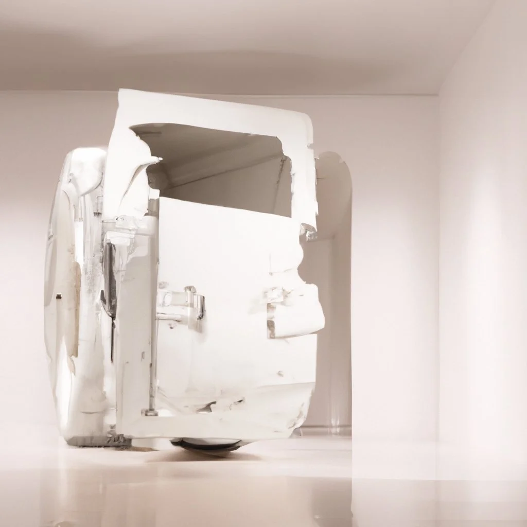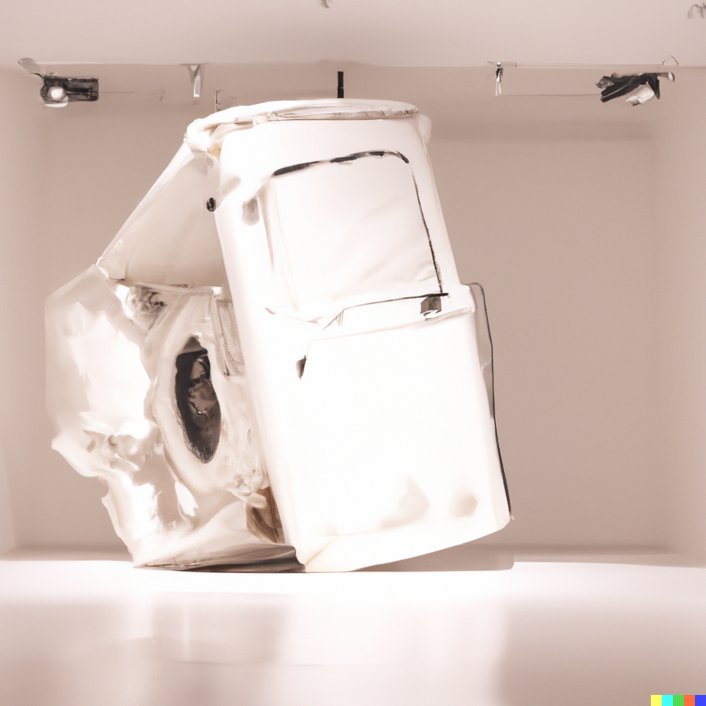 Abstract sculpture resembling a white, distorted vehicle against a minimalist white background.