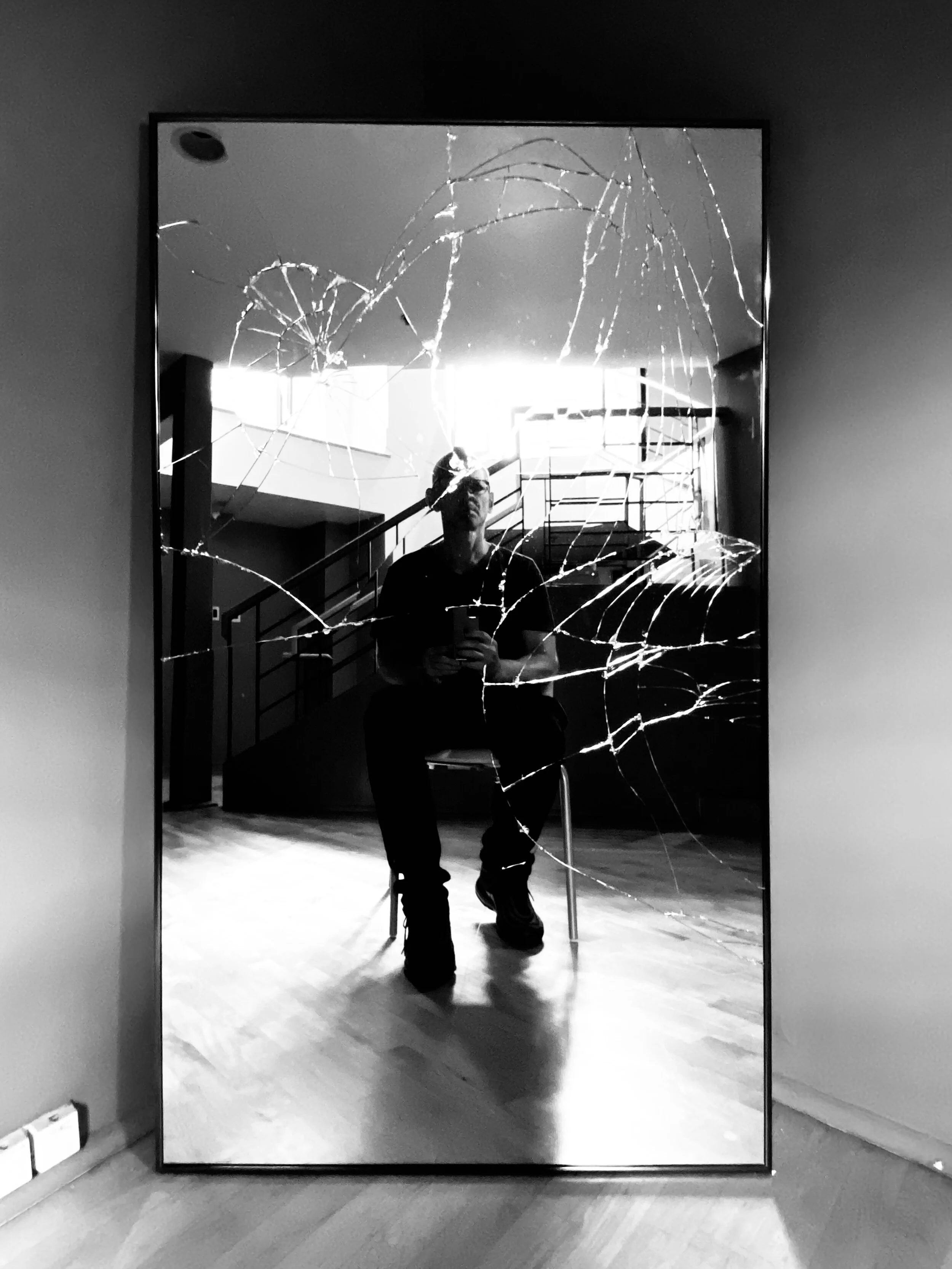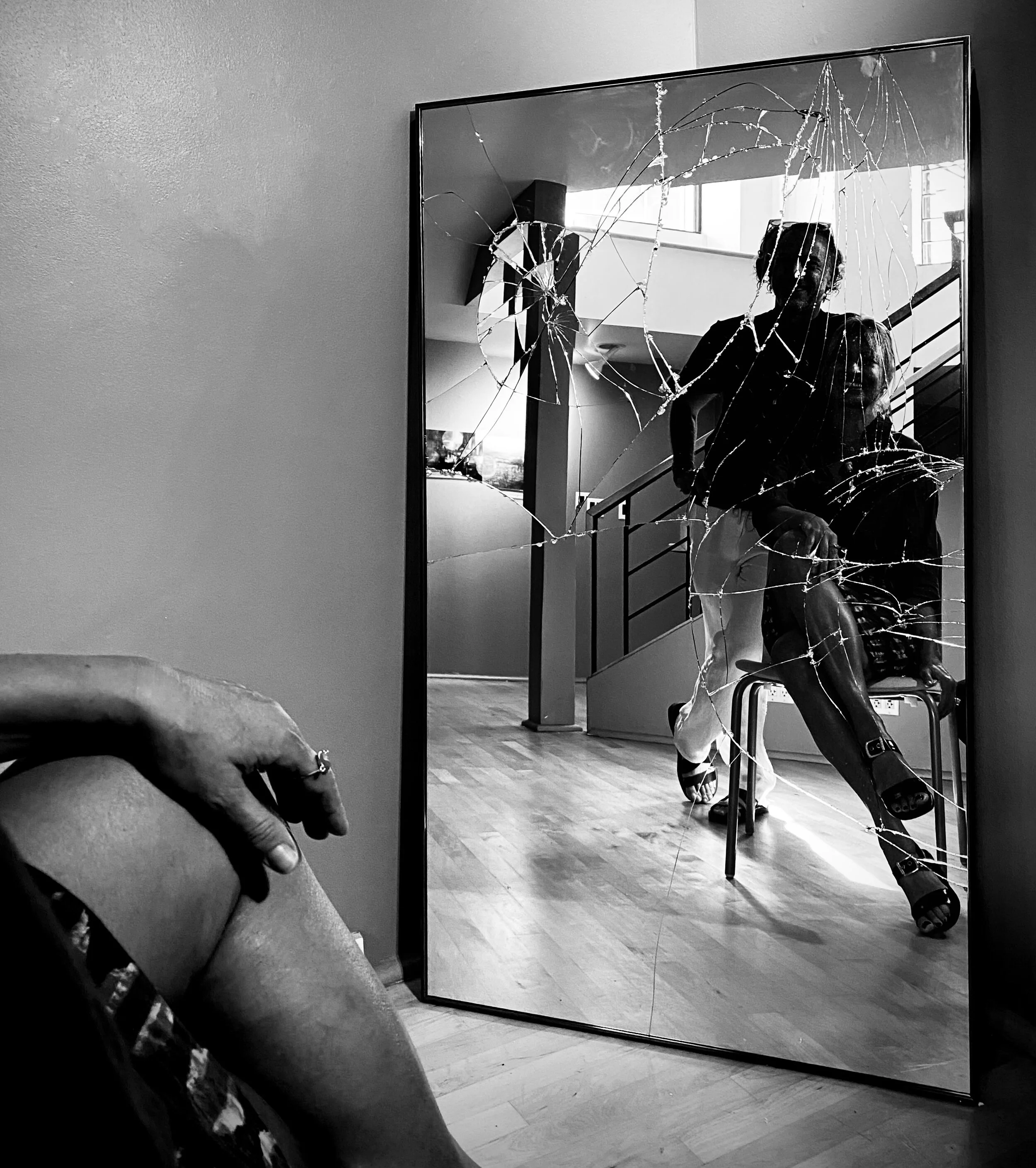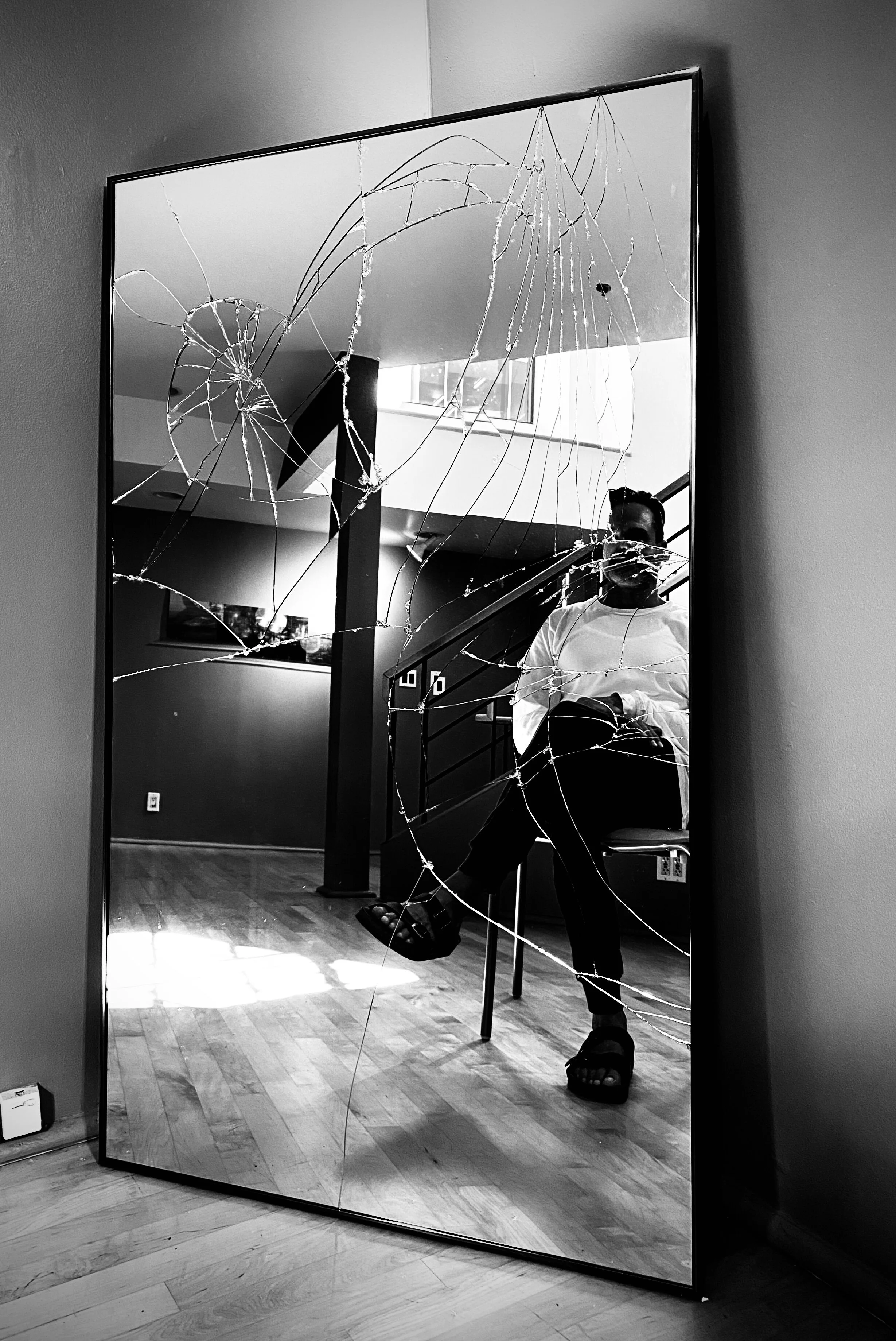 A person sitting in front of a large, cracked mirror in black and white. View fullsize