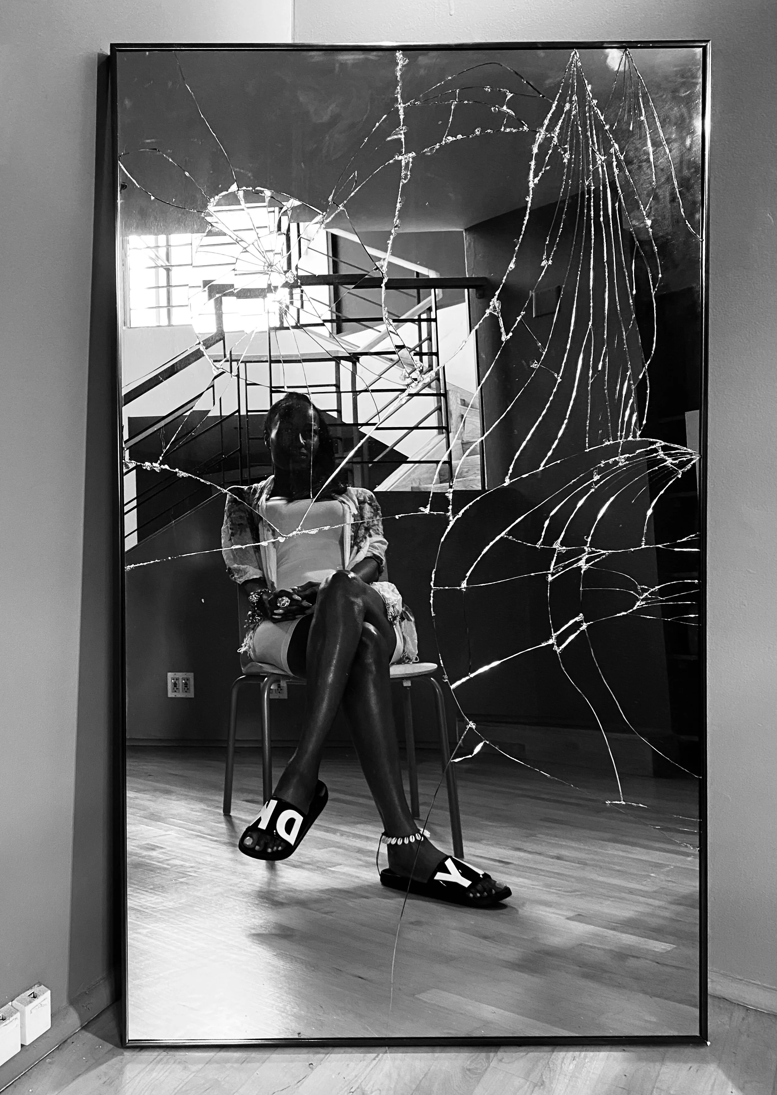A person sits in front of a large, cracked mirror reflecting a staircase. The scene is in black and white, with the person wearing a dress and sneakers. The mirror's fractures create an abstract pattern across the reflection. View fullsize