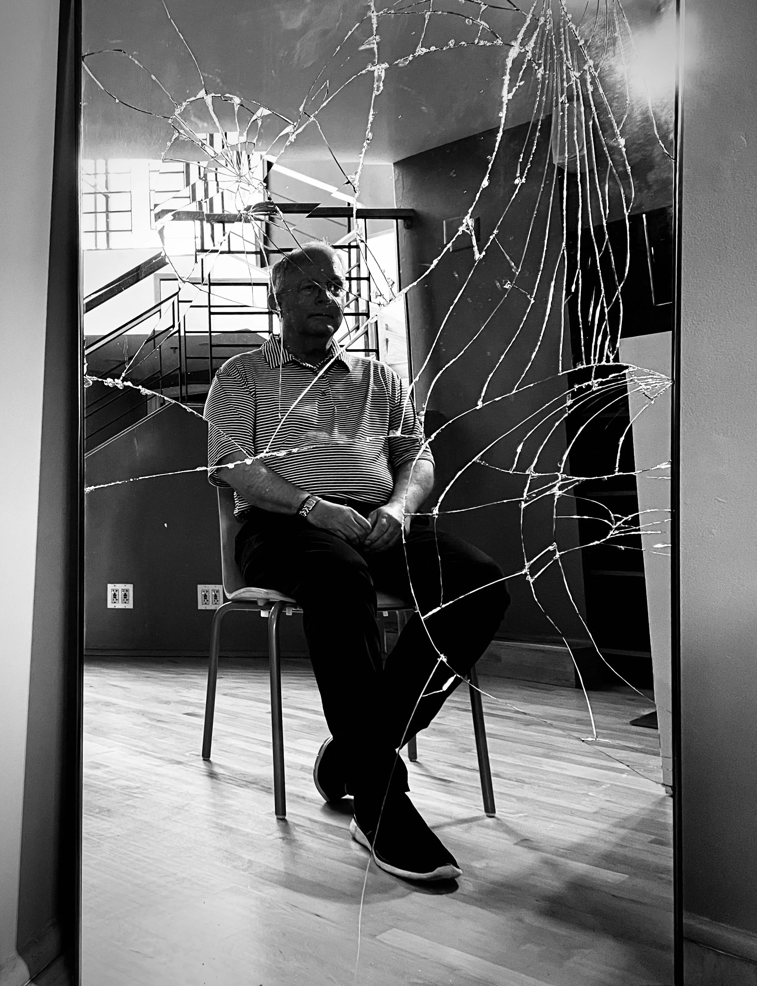 Black and white image of a person sitting in front of a cracked mirror, capturing a reflective self-portrait. The background includes stairs and an interior setting with natural light.