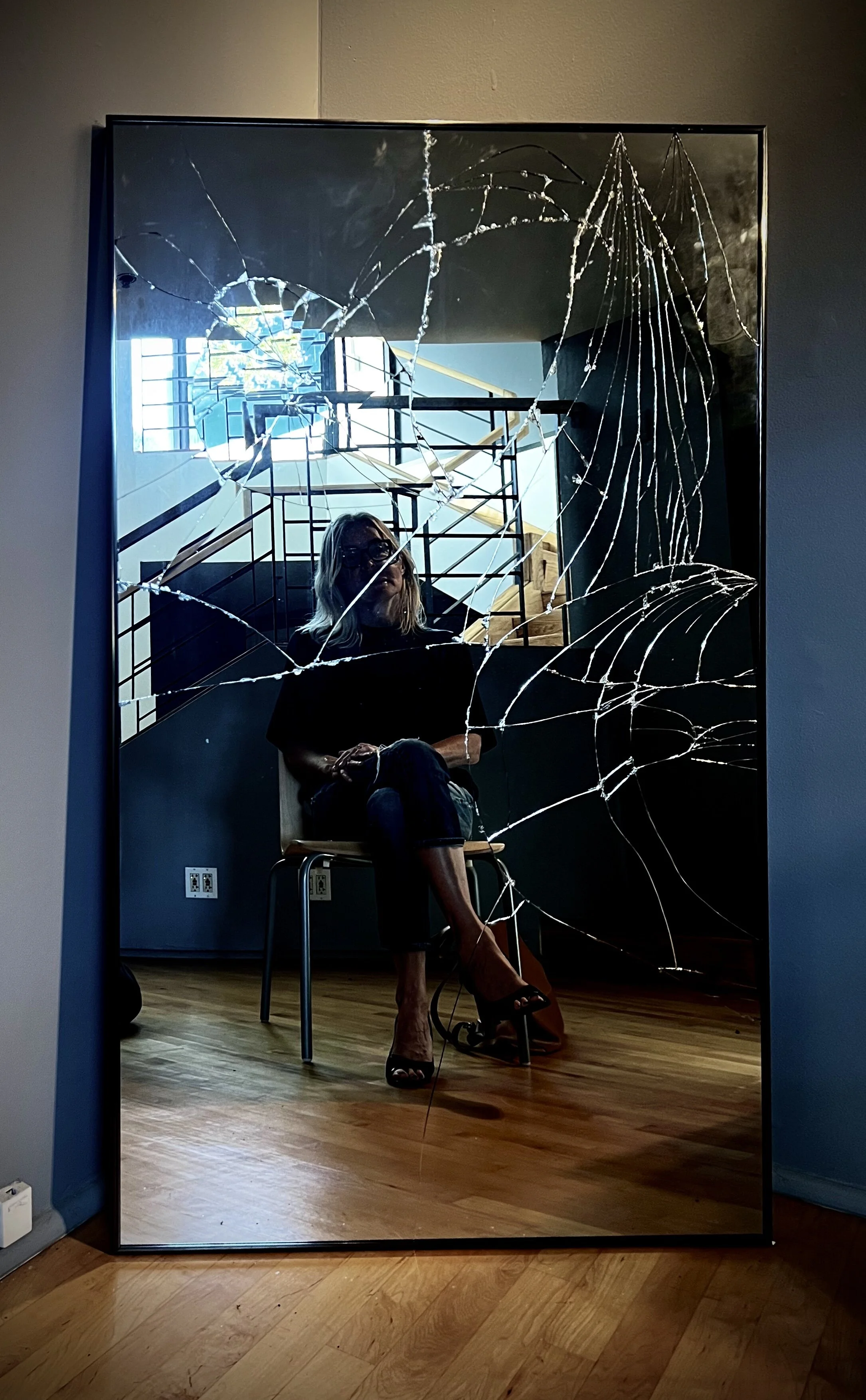 Black and white photo of a woman sitting in front of a large, shattered mirror. The mirror reflects a staircase and part of a room. The woman's reflection is fragmented, blending with the cracked glass patterns.