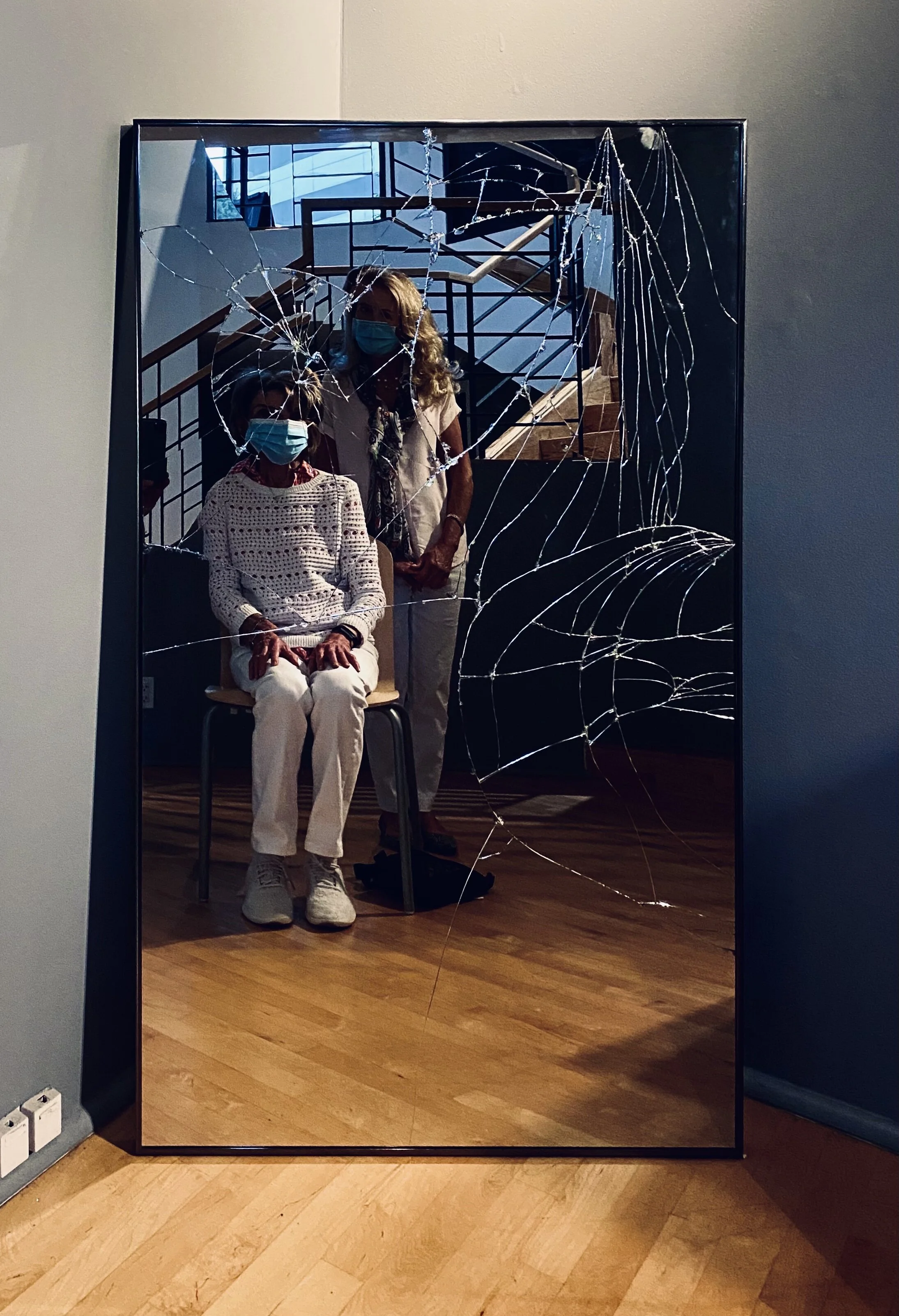 Two people wearing masks are reflected in a large cracked mirror, standing in a room with wooden flooring and a staircase in the background.