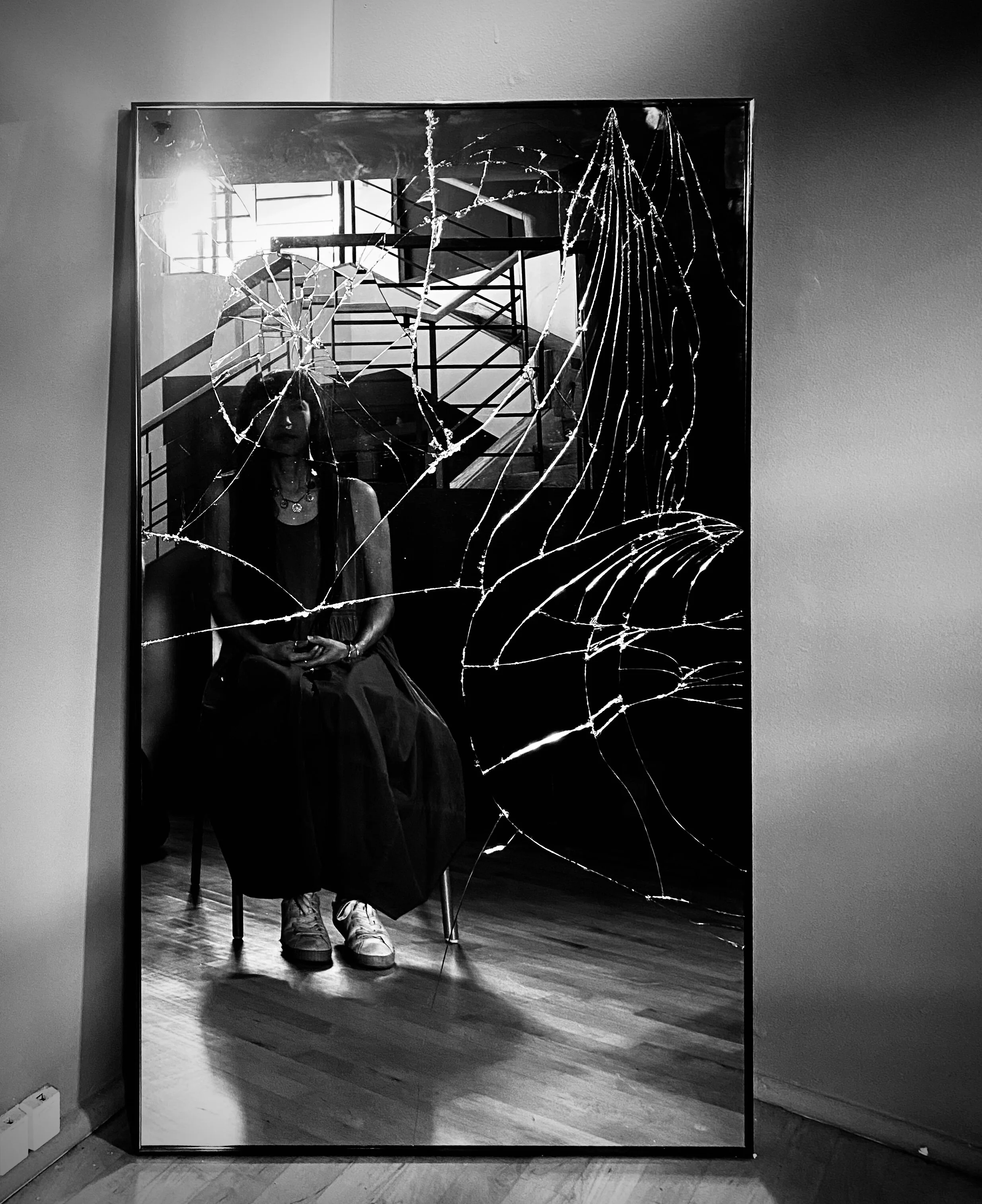 A person sits in front of a large, cracked mirror reflecting a staircase. The scene is in black and white, with the person wearing a dress and sneakers. The mirror's fractures create an abstract pattern across the reflection.