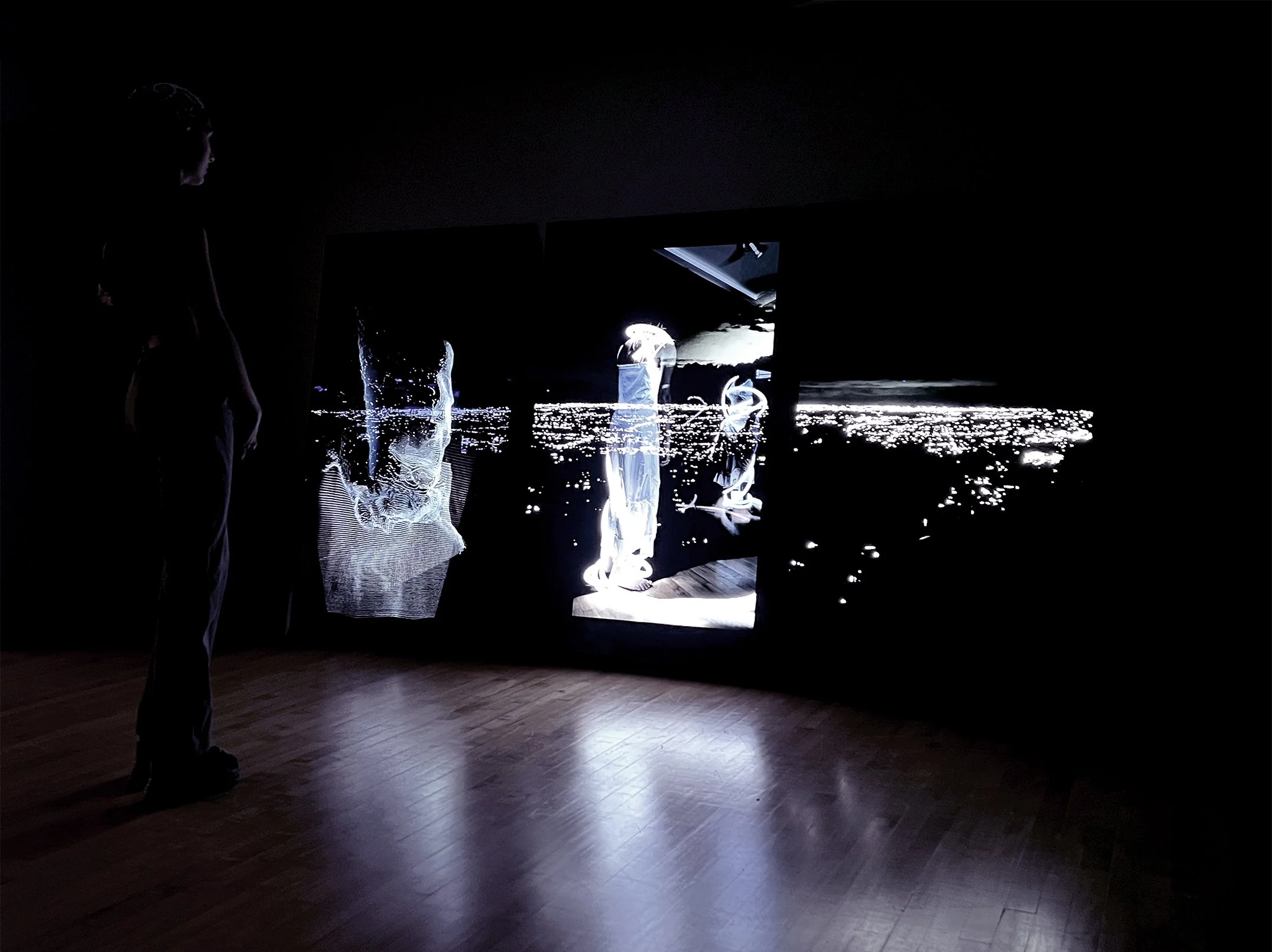 Two digital art displays in a dimly lit gallery, featuring abstract figures and hands with blue tones. Wooden floor visible.
