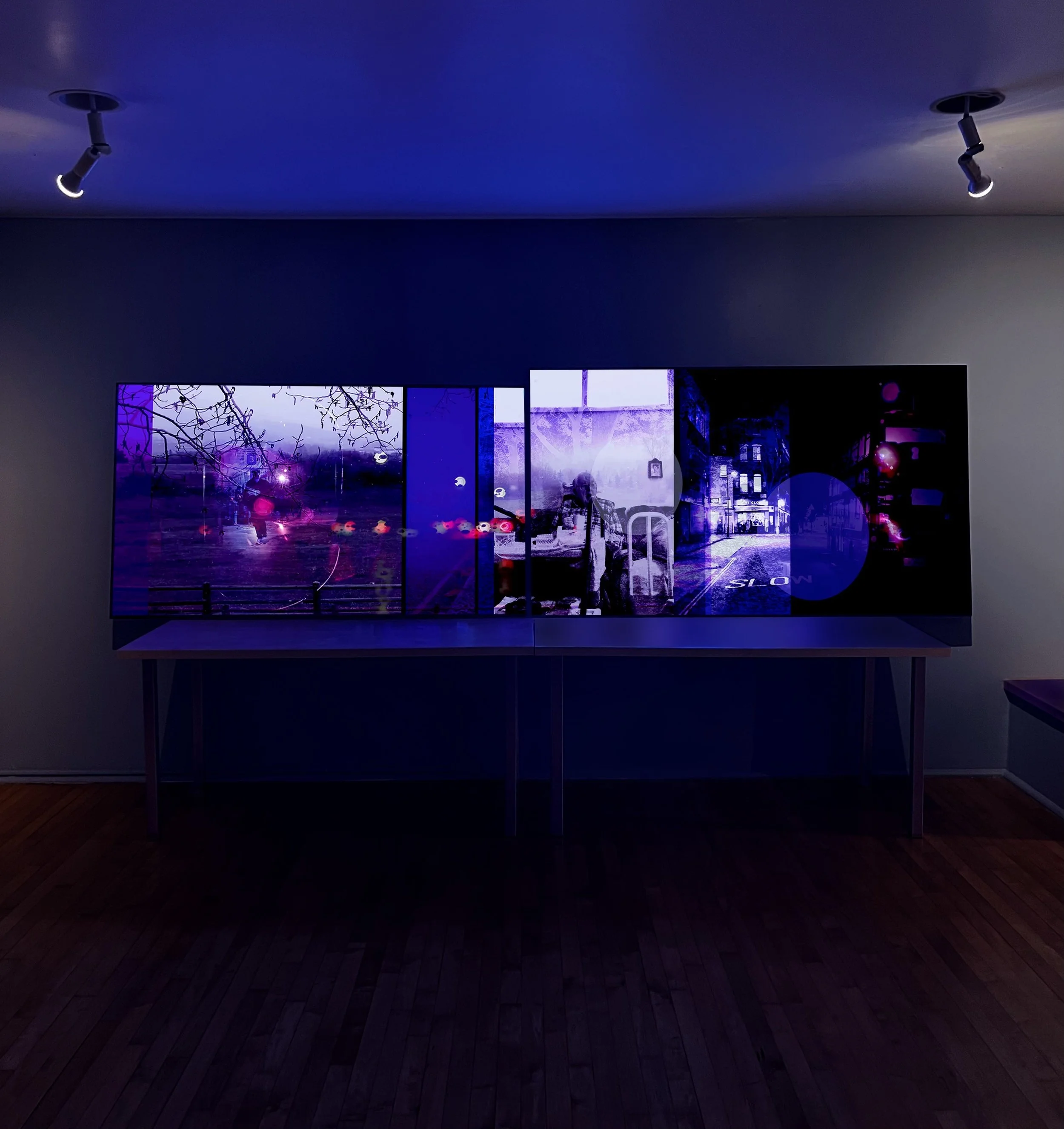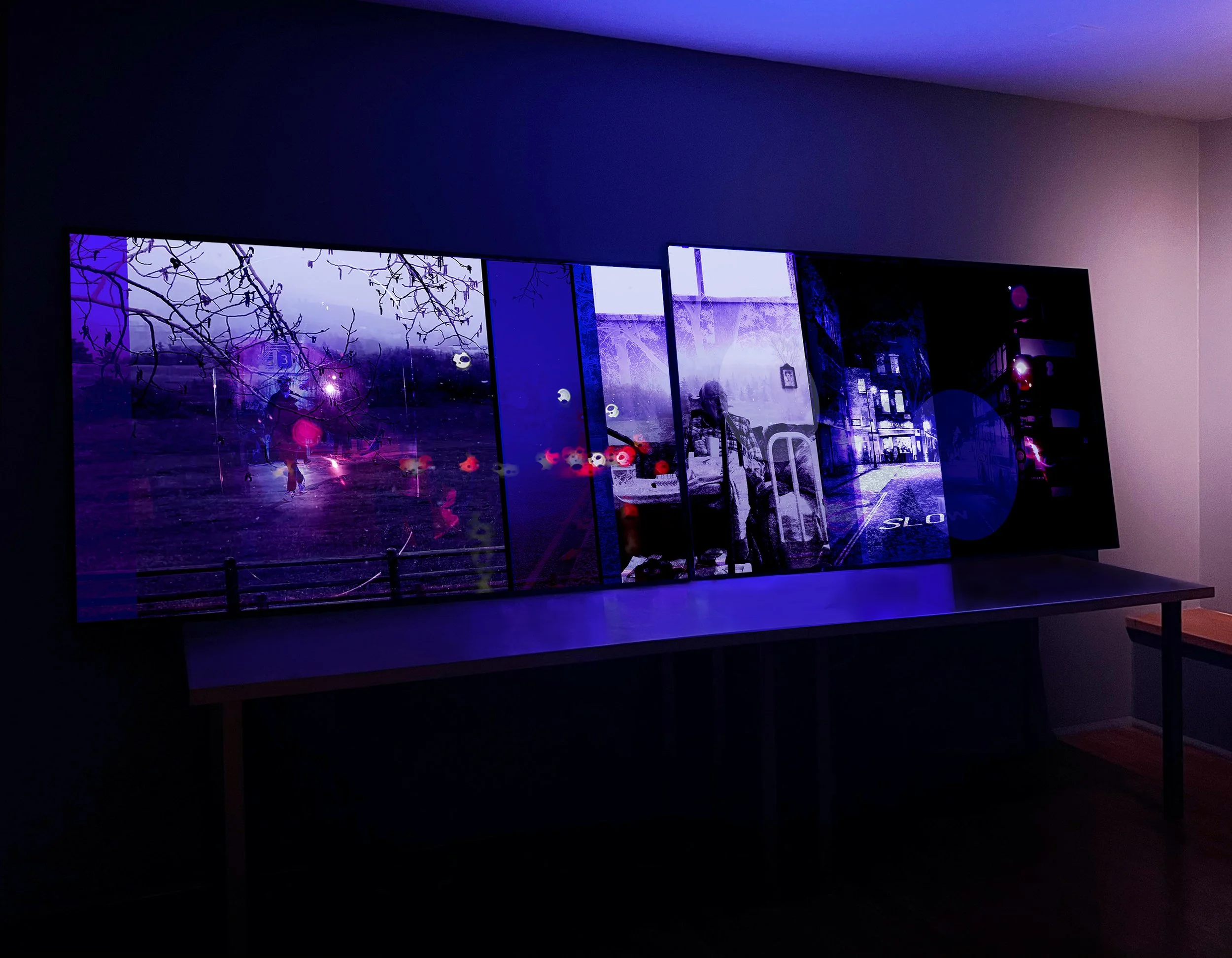 Digital art installation with abstract cityscape images displayed on multiple screens with a purple and blue color scheme, set in a dimly lit room with wooden floors and overhead spotlights.