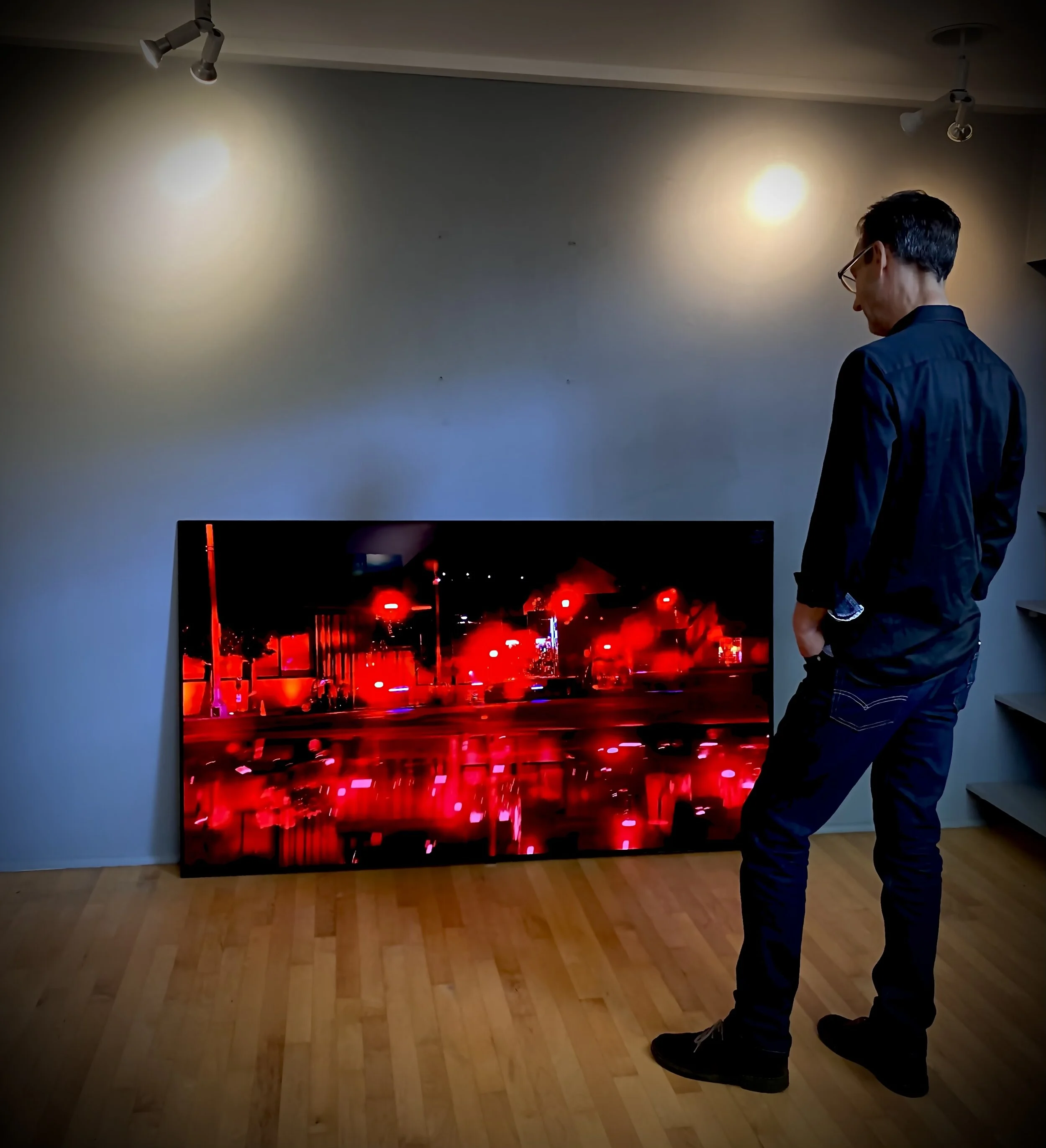 A multi-panel digital artwork features overlapping images of night cityscapes, vibrant blue abstract shapes, and scenic landscapes with power lines. The artwork is displayed on a neutral wall.
