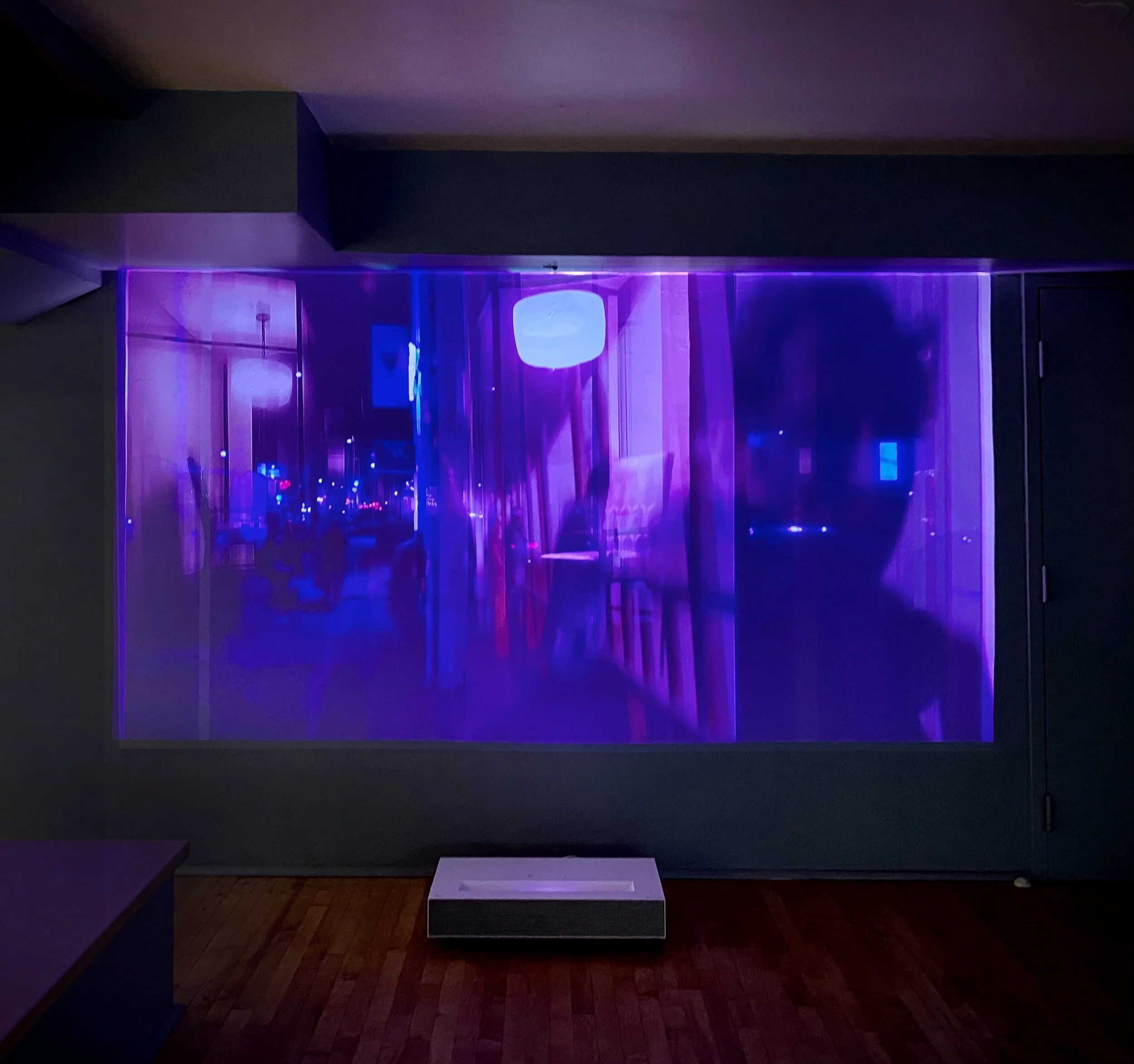 Purple and blue abstract projection on a wall in a dimly lit room, with a projector on the floor, wooden floorboards, and a ceiling with shadows.